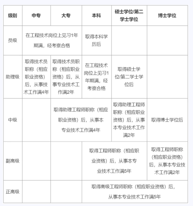 工程系列评审专业技术资格学历、资历情况对照表(正常晋升)