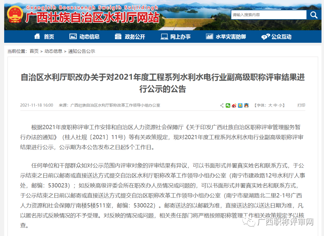 根据2021年度职称评审工作安排和自治区人力资源社会保障厅《关于印发广西壮族自治区职称评审管理服务暂行办法的通知》(桂人社规〔2021〕11号)等有关政策规定,现对2021年度工程系列水利水电行业副高级职称评审结果进行公示,公示期为本公告发布之日起5个工作日。
